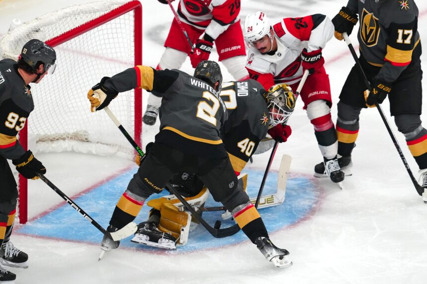 Eichel opened the scoring midway through the first period, taking a feed from Brandon Saad and firing a shot that deflected off defenseman K’Andre Miller’s stick and into the net. Less than two minutes later — moments after Hill left the game — Dorofeyev slipped past the Carolina defense and beat Andersen with a smooth forehand-backhand move to make it 2-0.
